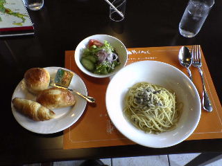 最終目的地 (白崎海岸) R42をひた走り由良町に入ったので、そろそろ白崎海岸の看板有るかな〜と思いながら・・・全然出てこない・・・ワー! 御坊市に入ってしまった!! 有名な観光地のはずなのに、白崎海岸の案内看板全く無し!!! 地図を確認し、R42Uターン。少し戻って右折のはず・・・ またまたワ〜〜!こんな細い道かよー、急右折になりナンさんに迷惑かけてしまいました。(反省) その先でまたまた右折の所を、間違えて左折・・・反省し まくりのSBでした。 そんなこんなで、なんとか白崎海岸に到着できました。ふぅー ここまで道に迷い焦ってて気づかなかったのですが、「腹減った〜」。さっそく「サンリ・ベール」でお食事をいただきました。SBは1200円のパスタランチ(写真)です。こんなに迷惑かけたのに、ナンさんがご馳走してくださいました。(感謝) 「サンリ・ベール」はパン食べ放題なので、空腹時にはお勧めです。 |
