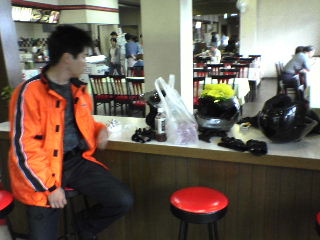 雲の切れ目に思い切って出発したものの西名阪入って少し走ると、またも大雨・・・たまらず3度目の雨宿りでSAに入るが、体がボトボトで座ることすらできずウロウロするばかり。