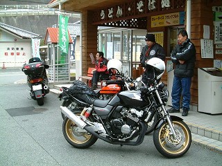 道の駅・杉の湯 川上(AM11:15) 今日は名古屋からdaihachiさんが参加して下さるので第三集合場所を設けた。お天気ますます怪しいがバイクは多かった。 |