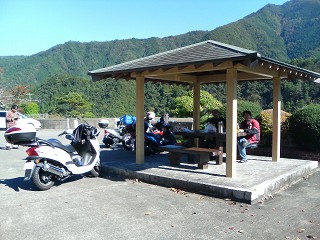 風屋ダム(昼食) 出発時にサティで昼食を買ってきたのをここでいただく。今日は快晴で気持ちいい。V125Gも絶好調でJOG90とは大違いでラクチンだ。 |