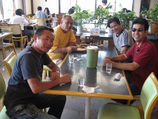 養老SA(夕食) 関西組7名で夕食。レストランが行列で軽食コーナーに逃げてくる。少し疲れの色が・・・それとも空腹かな。 |