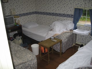ペンション部屋 少し狭いが贅沢はいえない。キャンプに比べれば随分楽なはずだ。風呂は皆乗り合いで近所の「天女の湯」へ出かけた。 |
