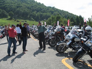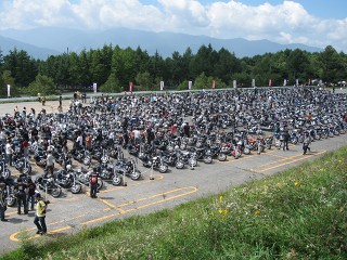 富士見高原スキー場 清泉寮より約10kmほど走って到着。今年はお天気が良いので、すでに凄い台数が集まっている。ホント凄い熱気。 |