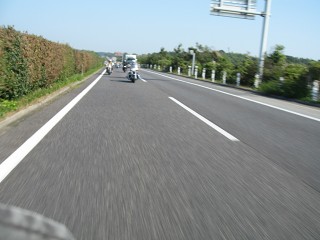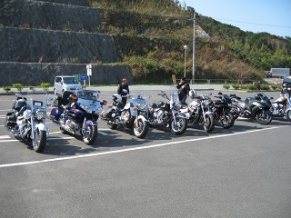 伊勢自動車道・安濃SA AM9:30 渋滞もまったく無く集合時間の1時間前に到着。でもすでに宇治の角田さんが到着されていた。 その後、だっ!さん親子とも無事に合流。 | 伊勢自動車道 総勢8台での快晴ツーリングとなる。 休日1000円になってから高速道路は混雑気味だが、だっ!さんの先導で気持ちよく走れた。 |