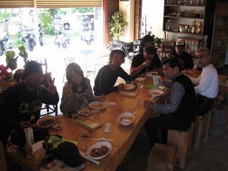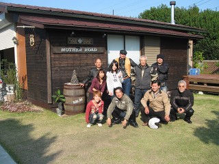 昼食 長机を囲み皆さんと昼食タイム。オープンテラス的な感じで楽しい一時を送った。会話も弾みいろいろな知識が飛び交った。 | 全員集合 本日のメンバーとMother roadさんとの集合写真。爽やかなお天気で皆さん笑顔♪ この後はIKimasyoka志摩観光。 |