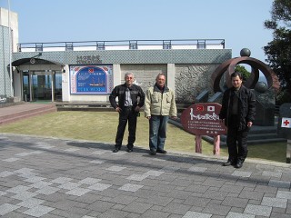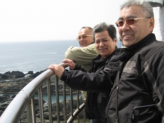 灯台頂上 潮岬の風に癒される〜おじさん4人。ホントこの気持ち良さが止められません。沖の小さな島では釣りをしてる人が沢山いた。 |
