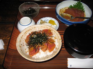 鰹茶漬け 年季の入った建物に入ると愛想良く迎えていただいた。全員鰹茶漬けを注文し、食べ方を教わる。ん〜ん何とも言えない美味しさ!! |