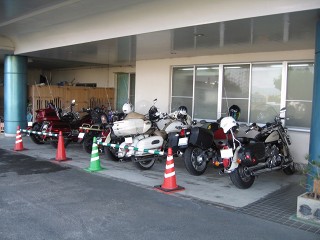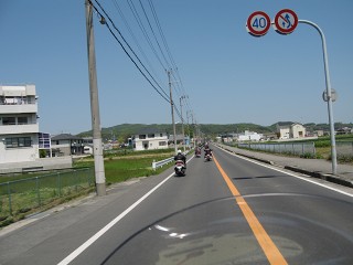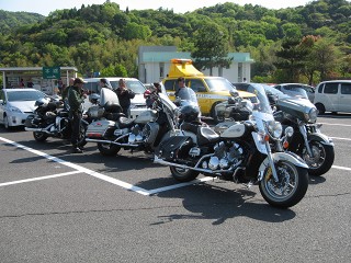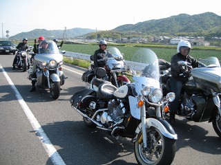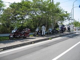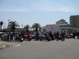 41.キャンプ場前2 AM8:30 30台オーバーのバイク、バイク。これだけの台数で走るのは久しぶりだ。先ずは給油して南方に向かう。 |