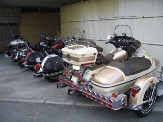 14.慶野松原荘3 sbooロイヤル君は残念ながら青天井で駐車。 鞆の浦パパさんはH-Dウルトラサイドカーで登場、全幅190cmオーバーで大迫力。 |