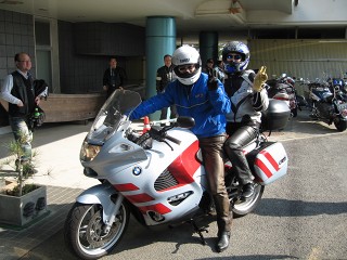 38.慶野松原荘前 越後屋さんご夫妻は岐阜に向かわれるとの事で、一足先に出発。奥様はロイヤルよりもBMWの方が楽だそうだ。さすがツーリングマシン。 |