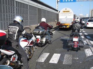 72.阪神高速神戸線 やっぱり大渋滞の神戸線。ここは道幅が狭くて抜けることが出来ないので辛い。こんな時は小さなバイクが有利。 |