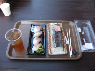 10.黒潮市場 昼食 丁度昼時なので混雑している。温かい麺類が欲しかったのだが長蛇の列で諦めた。秋刀魚寿司とイカ足寿司の昼食をいただいた。 |