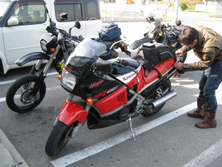 2.泉南IC横ファミマ AM8:30 おぉ〜〜ついに ノリさんNEWマシン・・・と言ってもマシンは20年位前のものらしい。 フルパワーの忍者はキット速いんだろうな〜 |