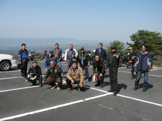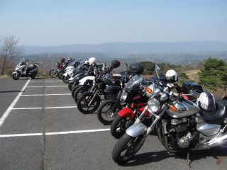 15.めえめえ牧場 ここは比較的高い位置にあり景色が良い。14台のバイクを並べて記念撮影。比較的小さなバイクが多いので威圧感がなく青春の香りがする。 |