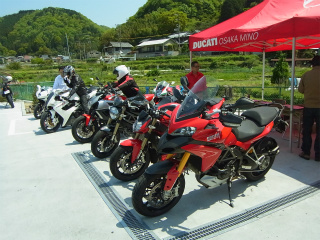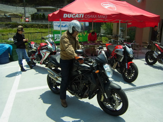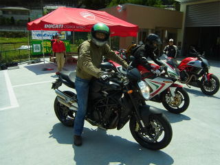 5.試乗会 今日は、ビモータ・ドゥカティ・MVアグスタの三社合同の試乗会である。高価なマシンが並ぶ試乗会なのだ。あきらくんお目当てのMVアグスタ。 |