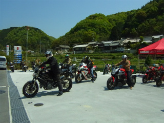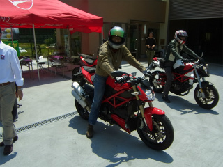 9.試乗会5 今度は竹さんがMVアグスタに試乗。コンパクトな車体で、前につんのめりそうな感じ。 SS並みのレスポンスでかなり速そう。 | 10.試乗会6 あきらくんは、ドゥカティ・ストリートファイターに試乗。かなり乗り易いと高評価だった。もしかすると・・・?? いずれにしても速いマシン。 |