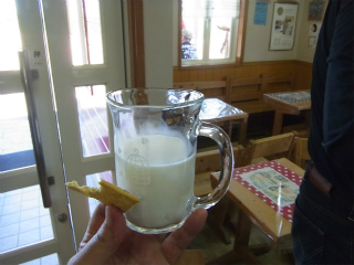 28.ミルクパレット 4 ソフトをいただくとノドが渇き「搾りたて牛乳」もいただいた。写真の前にビスケットをカジってしまい〜食いしん坊丸出しの絵になってしまった。 |