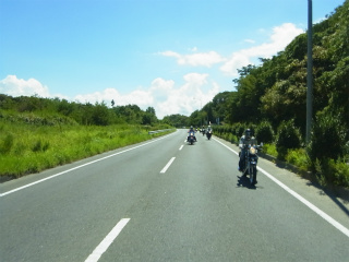 16.県道10号線 そして20台のバイク+クルマ1台で「うなふじ」さんまで大移動。モタードは背が高いので(胴長?)後ろまで見渡せるのだが今回は無理!! |