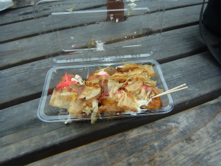 9.占冠PA 昼食 PM12:25 昼食は時間の都合で割愛・・・ではなくて軽食で済ませる。ココまで来て「たこ焼き」なの・・・ でも粉もんが食べたかったので仕方がない。 | 10.占冠PA2 お天気は不安定だが、気温は北海道にしてはかなり高いと思う。停車時にはウェアを脱がないと汗が出てくる程、暑い。 |