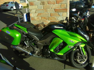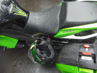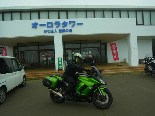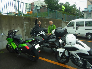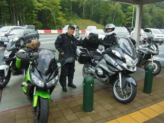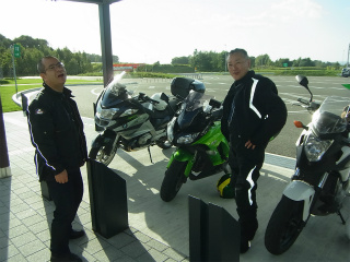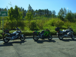 11.道東道 さっきまでは青空だったのだが、突然雨が降り出した。これも北の大地の特徴やね。雨が降っても苦にならないのが北海道の良さ(^_^)v | 12.長流枝PA? CさんのNinja1000ABSはパニアケース付のフル装備マシン。ワイバンが光ってる。TちゃんのBMWもアクラが良い感じで響いている。 |