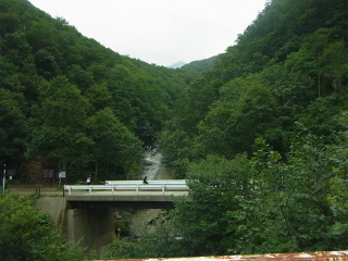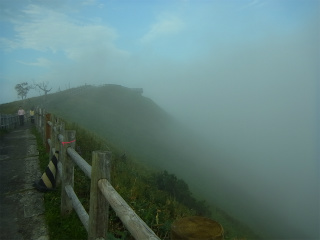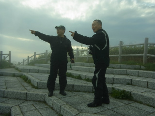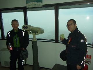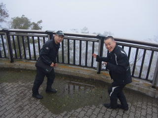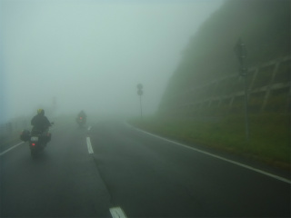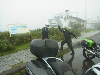 111.琵琶瀬展望台 頭一周のパノラマではなく、360度の大パノラマが見られるところなのだが、残念ながら霧と雨で真っ白。また次回の課題やね。 | 112.琵琶瀬展望台2 ココまで強く雨が降るともうライダーズ・ハイの状態かも(笑) レインパンツの効力も2日間が限界みたいで、ついにズボンに浸みてきた。 |