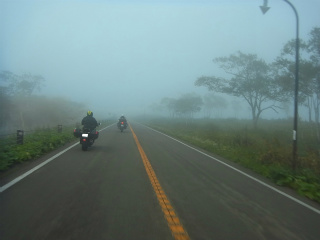 57.R334 知床峠3 多少の霧でもガンガンと突っ走る。こんな天候時にパンダさんは出ないので、かえって安全なのかもしれない・・・どこまでも前向き♪♪ | 58.R334 北の大地の天候は気まぐれなので予報は雨でも色々なお天気となる。ココでは路面が乾きかけている。テンションが戻って来たよ〜〜 |