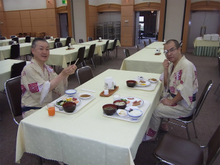 27.川湯観光ホテル3 朝食 どんな場面でもポーズを取ってくれるのは嬉しい(意味は別として・・笑) 朝食は・・アレ忘れた。何を食べたんやろ??写真確認せな。 | 28.川湯観光ホテル4 雨は降ってなくまずまずの朝の出だしとなる。一日経つと慣れたのか「ボケ殺し」が感じなくなってきている。新鮮さが無くなったせいかな(~_~;) |