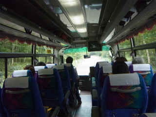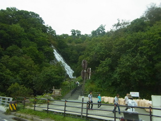 35.知床シャトルバス 自然センターからシャトルバスに乗り〜カムイワッカ湯の滝→知床五湖と進む。観光客は多くてバスはほぼイッパイかな。 | 36.カムイワッカ湯の滝 これがかの有名なカムイワッカ湯の滝である。その昔はバイクでも行けたようだが、何キロも地道を進むのは大変だったろうと思う。 |