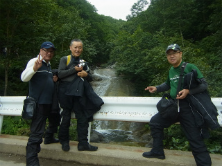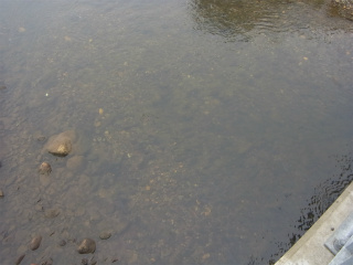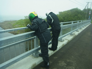 59.R244 この絵はどこかで見たような気がする。確か3年前も「川に向かってたたずむライダー3人・・・」とか言っていたような・・・ 癒されますな〜〜 | 60.R244 2 川? たくさんの魚が泳いでいる。「ほっちゃれ」と言うそうだ。まるで大阪弁みたいで面白い。ヨレヨレになった鮭のことをこう呼ぶらしい。 |