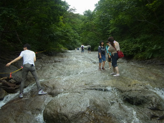 37.カムイワッカ湯の滝2 いつもIkimasyokaでも使っている三脚を持って行ったのでsbooの登場が多い・・・クマとちゃうよ〜〜 しかしジャケット脱いでも暑い。 | 38.カムイワッカ湯の滝3 我々はココで写真を撮り、滝は進まないことにした。このスタイルで滝登りはかなり辛いもんね。でも登って行く人は多かった。 |