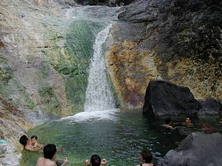 39.カムイワッカ湯の滝4 温泉の成分が強酸性で苔は生えないらしい。よって滑り難くて裸足で登って行けるようだ。もちろん本格的には専用のシューズが必要かな。 | 40.カムイワッカ湯の滝5 これは他からいただいた写真だが、滝を登っていくと湯溜まりがあり浸かれるそうだ。当然だが脱衣場はなくて大自然を楽しめる。 |