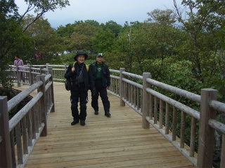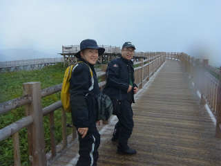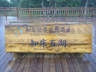 45.知床5湖4 うぅ〜降ってきたよ〜〜大粒の雨が。1湖も諦めて木道を帰還することになる。ジャケットは防水だが帽子は透水なので頭ボトボト。 | 46.知床5湖5 出発前に、この看板の前で三脚立てようとしたのだが混雑していたので後にと思っていたらこの雨。今は誰もいない・・・トホホ。 |