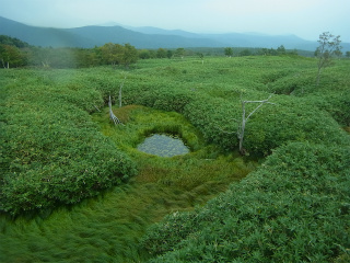 41.カムイワッカ湯の滝6 こんな感じでオホーツクに流れ込んで、最後にはカムイワッカの滝となって終わる。それにしてもココで熊が出たら・・・うぅ〜怖ろしい。 | 42.知床5湖 知床五湖はきれいな木道が整備されている。ぐるっと歩いて回れるのだが何しろ暑い。とりあえず1湖を目標に歩いてみる。 |