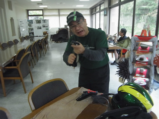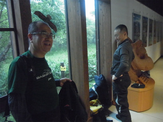 47.知床5湖6 知床フィールドハウス シャトルバスが来るまでの間、フィールドハウスで雨宿り。我々の足元には水溜りができている。傘みたいな帽子が必要だ。 | 48.知床自然センター駐車場 Tちゃんが〜その昔、豪雨の時にホルダーにヘルメット掛けていた友人の話をすると・・・Cさんの顔色が変わった・・・ま・まさか!? |