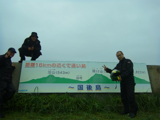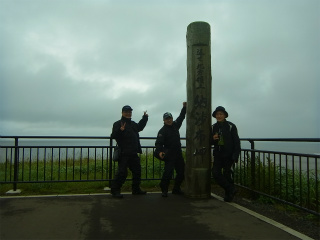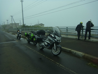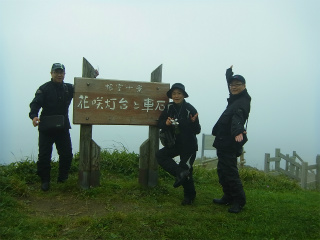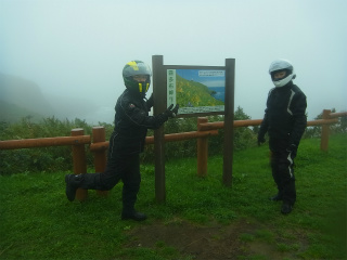 105.霧多布岬 駐車場 雨に打たれながら霧多布岬までやって来た。向こうにはBMWタンデムのご夫婦が来ている。さすが霧多布で霧の風景。 | 106.霧多布岬2 チョンワ〜ポーズに感謝。雨でヘルメットを脱ぐことが出来ない。ココはアザラシを見ることができるらしい。我々とは違うよ〜(笑) |