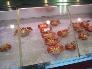 67.野付半島NC5 そして海の向こうには国後島がすぐそばに見える・・・はずのところ。今日は天候が悪いので薄っすらとしか見えない。 | 68.花咲ガニ店 最近天候が悪いので小さめの花咲ガニしかないとの事で、良いものが水揚げされた時に、茹で上げで送ってもらうことにした。 |