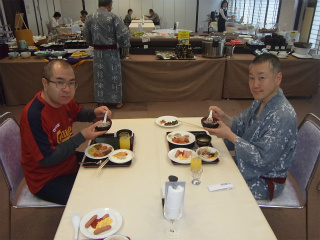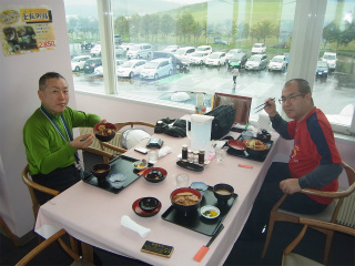 77.海陽亭 朝食 北海道での朝食は、イカやトロロ昆布などが必ずあって地域性を感じることができる。いつも朝は雨が降っていないので助かる。 | 78.海陽亭2 出発 AM8:35 そして今日もハイテンションで出発する。もうすでに長野ナンバーさん達は出発済み。我々は大宮・秋田・札幌とバラバラナンバーなのだ。 |