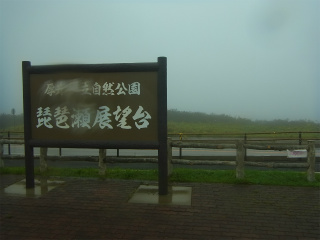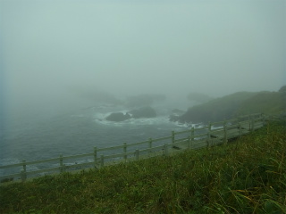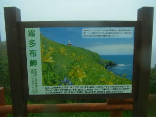 107.霧多布岬3 キレイな看板とよく似たアングルなのだが霧と雨で霞んでいる。でも普段の美しさは容易に想像できる。また晴れの日にやって来たい。 | 108.霧多布岬4 比較のために本来の姿の看板を撮影。正式には「湯沸岬(ゆとう)」と言うらしい。近くには整備されたキャンプ場もあるとのこと。 |