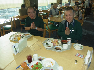 123.釧路プリンスホテル8 朝食 Cさんのバイクは大きな被害こそ無かったものの、初めての転倒が台風によるモノになるとは予想だにしなかったと思う。 | 124.釧路プリンスホテル9 出発AM8:20 修行僧スタイルで食事を終えて、最終日の晴天RIDEに出発する。Ninjaさんはカウルへの傷とウインカーの割れが主な被害となってしまう。 |