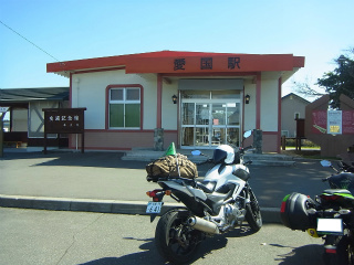 133.帯広・広尾道 道東道から分岐し帯広方面に南下する。のどかな風景が眼下に広がる。北海道の雄大さを味わう事ができる。快走できるので到着も早い。 | 134.愛国駅 AM11:10 旧国鉄広尾線の愛国駅に到着。現在は電車が通ってなくて、交通記念館となっている。天気は良いが台風一過のためか風は強い。 |