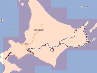 テーブルトップ Tちゃんが送ってくれた、テーブルトップの写真。今回は雨と霧で雄大な景色を見ること出来なかったが、また次回の楽しみに取っておこう。 | 行程地図 千歳市を起点として、道東方面が今回ルート。高速道でワープして、摩周湖→川湯温泉→知床→根室→釧路→帯広→トマム→帰還!! |