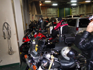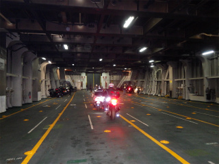 8.南海フェリー AM8:05 バイクと自転車を先に乗せてくれるのだが、下船はクルマが先なので、結局待たなくてはいけないのだ。船内は生暖かい。 |