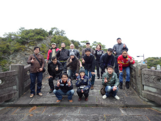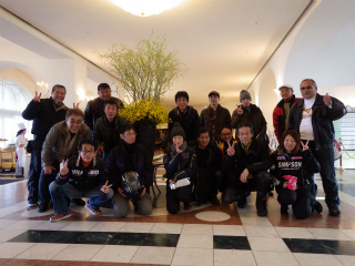 15.ロイヤルパインズH 2 ホテルの庭で参加者全員の記念撮影。お天気が回復して青空になったが結構寒い。みーちゃんが持ってくれているのが皆さんの記念品。 |