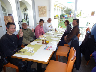 3.ロイヤルパインズH AM11:20 ここでクルマ組とも合流し全員集合。アレッ!!竹さんがまだ着いて無い。予約の時間があるので、とりあえず先にレストランに入る。 |
