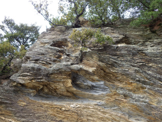 23.キャラ岩 キャラ岩っていう名で合っているのかは?? 細かい層になっていて木の根と一体化している。この辺りの岩はほとんどがキャラ岩みたい。 |