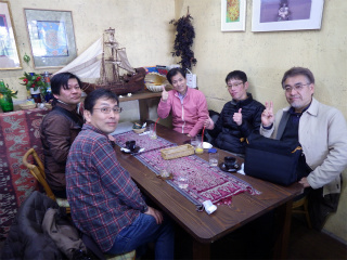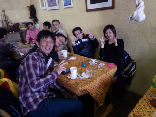 4.カーロ・エ・カーラ 送別会場 みーちゃん送別ミーティングなので真中に座っていただいた。みーちゃんは雨覚悟のバイク参加。 途中でヒョウが降ったらしい・・・(~_~;) |