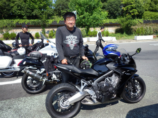 4.桂川PA 2 急遽参加でお披露目のわきさん。マシンはHONDAのNEWモデルCBR650F。奥様のマシンで慣らし中。わきさんが乗ると小さい(^_^;) |