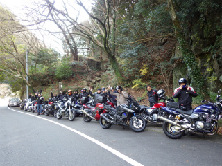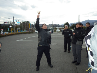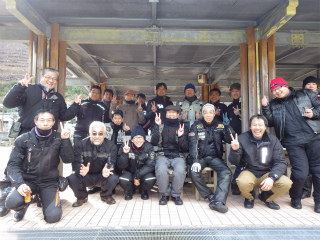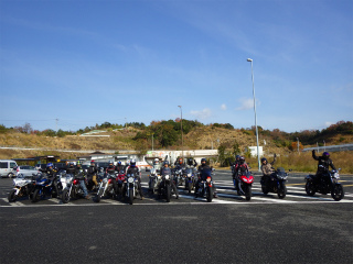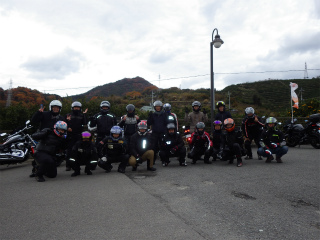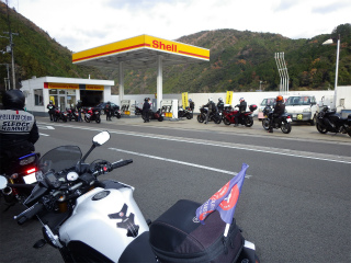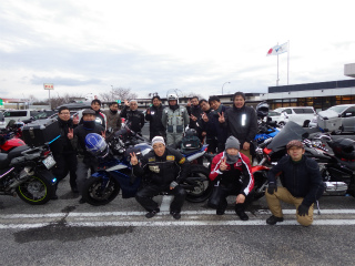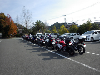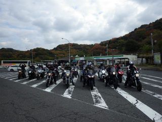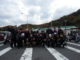 1.阪南IC前ローソン 第1集合 AM9:00 今年は12月でも異常に寒い日が続いている。忘年ツーもどうなることかと思ったが、今日はマシだ。ローソンで写真撮り忘れて車道にて。 | 2.阪和道・紀ノ川SA 第2集合 AM9:20 お久しぶりの白髪のYASUさんはじめ、大方の皆さんがすでに来られてた。前日雨だったので〜まだ路面が少し濡れている。 |