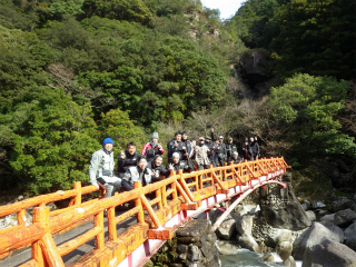 21.奇絶峡 2 これだけの人数がいっぺんに乗っても大丈夫なん!?とか言いながら全員での橋上ショット。チューチュートレイン風は出来へんね。 | 22.奇絶峡 3 sbooの下手くそな写真では分かり難いが、左上の大きな岩が迫り出しているように見えて、なかなかの大迫力だった。 |