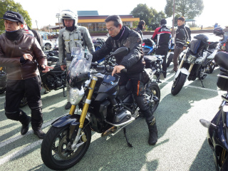 3.阪和道 紀ノ川SA AM9:20 早速のいぬやんコーナー。R1200Rは水冷の最新モデルでエンジンが大きく見える。本人曰く「このBMWはとっても優しいマシン」とのこと。 |